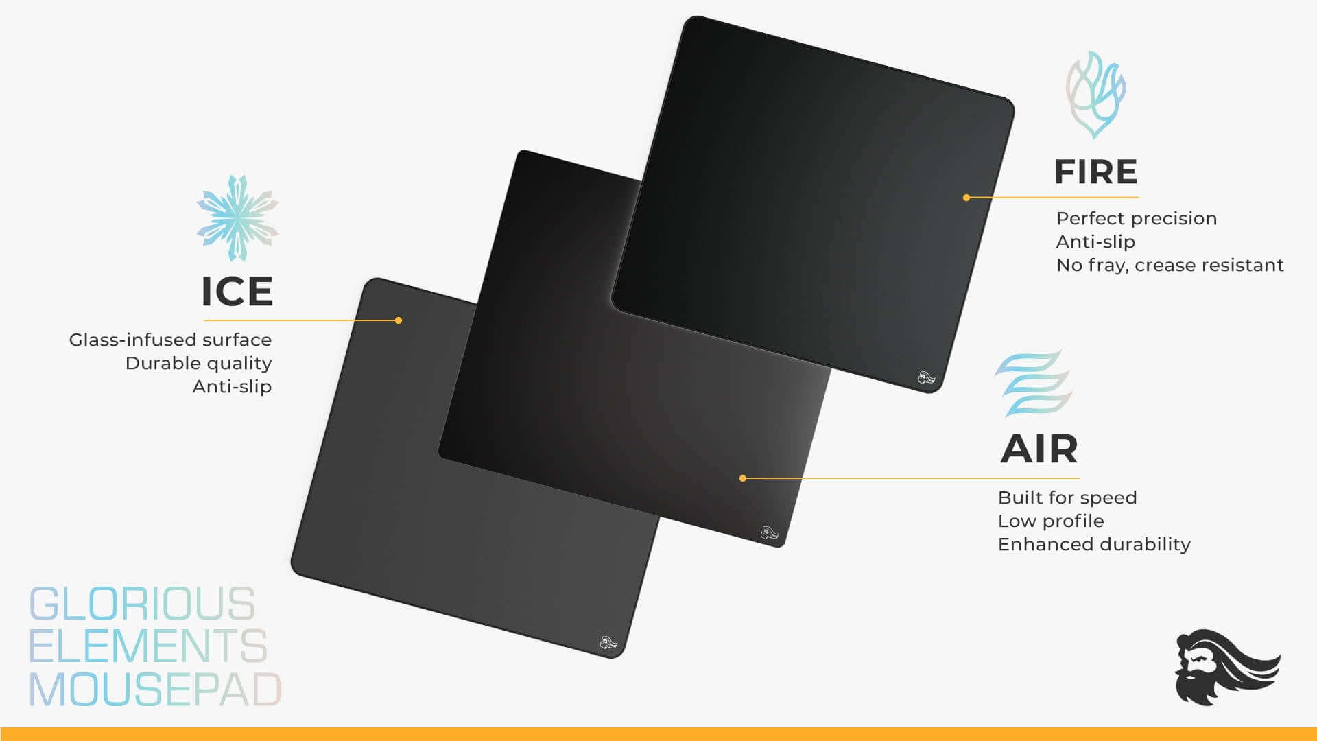 The Glorious Elements Mousepads are our line of premium, hybrid-surface mousepads designed for high-performance PC gaming. Each pad, Fire, Ice, and Air, offers players next-level speed and precision unmatched by a traditional cloth mousepad.