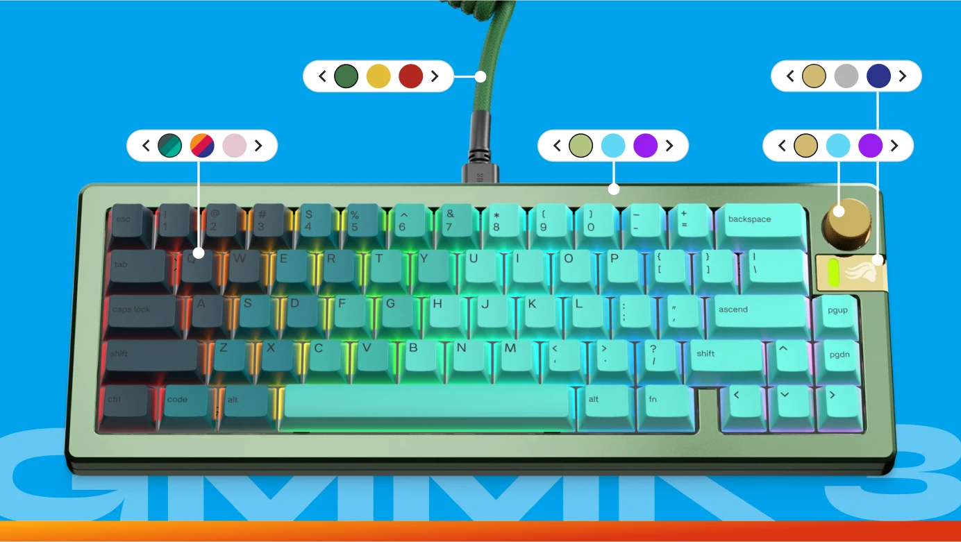 As the world’s most customizable keyboard, you can personalize everything: the top frame, bottom case, keycaps, badge, knob, cord, lighting, and even choose between polymer plastic or CNC-machined aluminum. Mix and match colors and materials to make it truly your own!