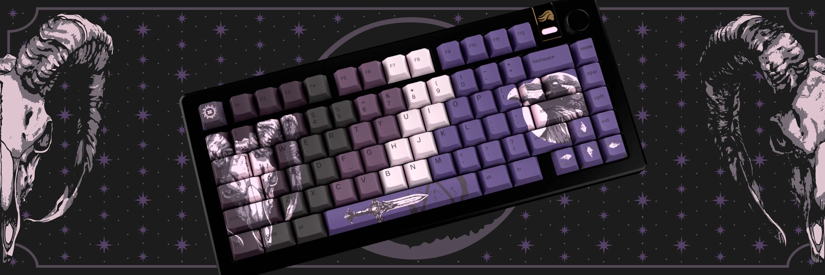 Inspired by elements of witchcraft and folklore, GPBT Black Magic features hand-drawn, stenciled-style graphics, including a haunting goat and an ominous raven. The novelty keys are designed to evoke the imagery of old spell books, complete with symbols reminiscent of a witch's daggers and potion skulls. Dark purple hues mixed with pale pink accents create a foggy, otherworldly aesthetic that will elevate any keyboard.
