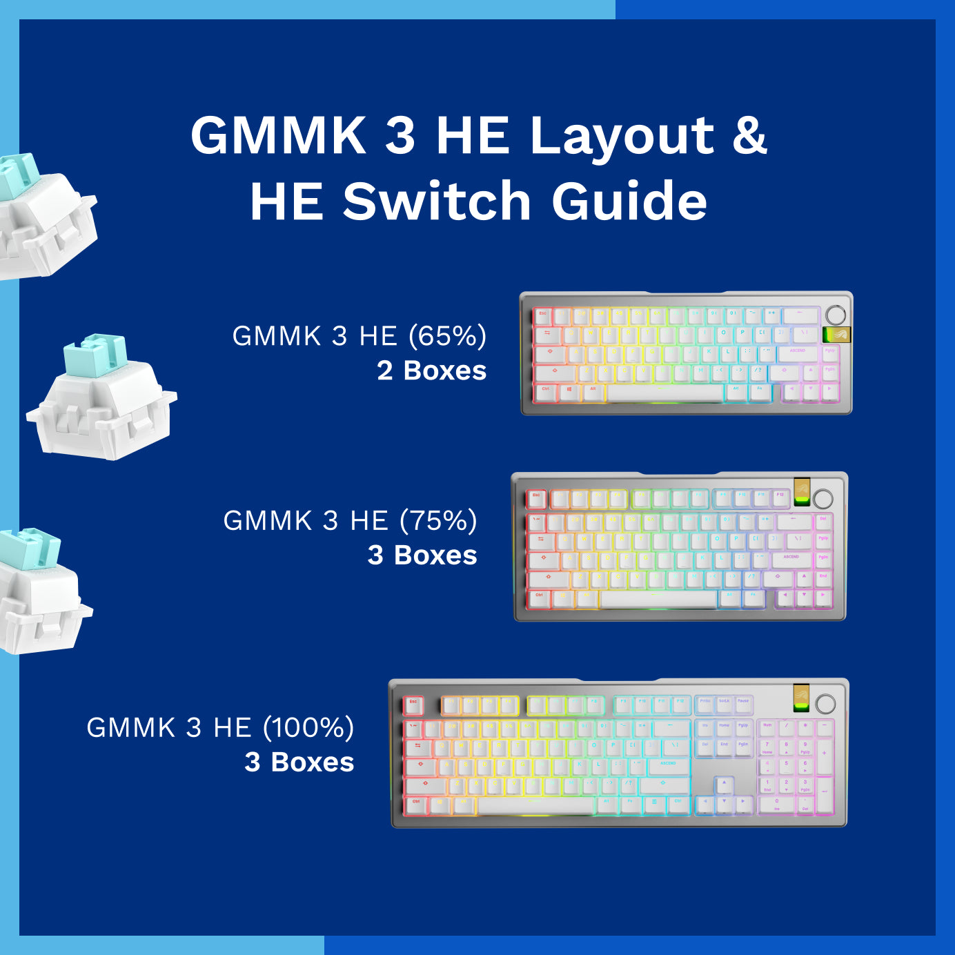Designed for GMMK 3 HE keyboards, these premium switches offer our smoothest linear press and two acoustic options: rich, marbly Standard or whisper-quiet Silent.