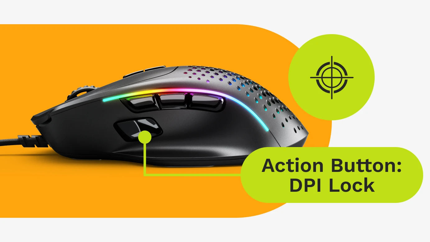 Line up game-winning shots effortlessly with DPI Lock. Press and hold the Action Button to temporarily reduce your aiming sensitivity (DPI) for precise aim, then release to return to normal. DPI target customizable via Glorious CORE 2.1. DPI Lock is enabled by default.