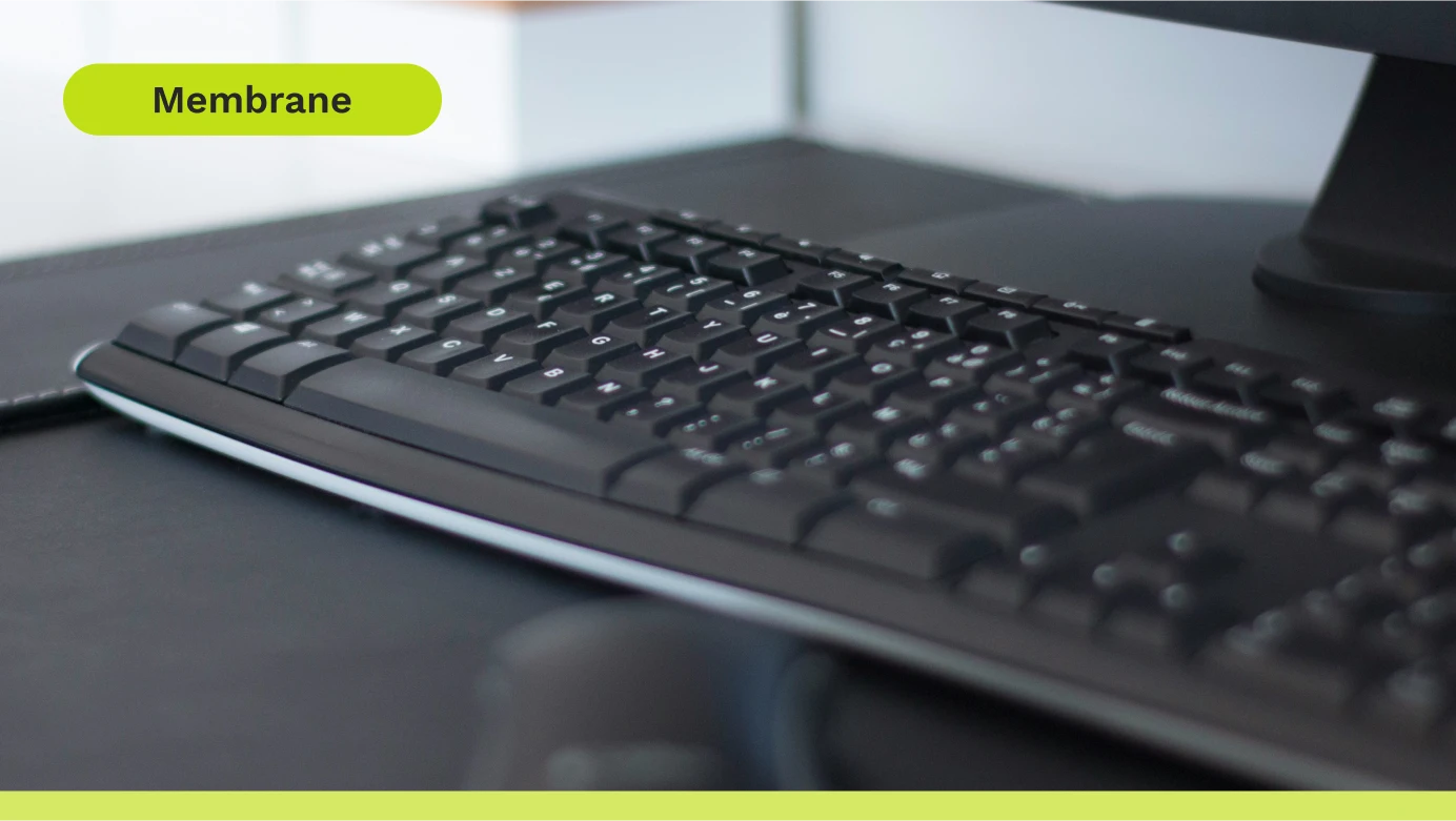 A membrane keyboard uses a large silicone rubber pad underneath the keys to register each press. They’re more affordable and easy to produce, which is why they’re commonly found in schools and offices. However, they lack the tactility, acoustics, and aesthetics mechanical keyboards are known for. Because there’s just rubber underneath the keycaps, keystrokes feel "mushy" and lack any key travel.