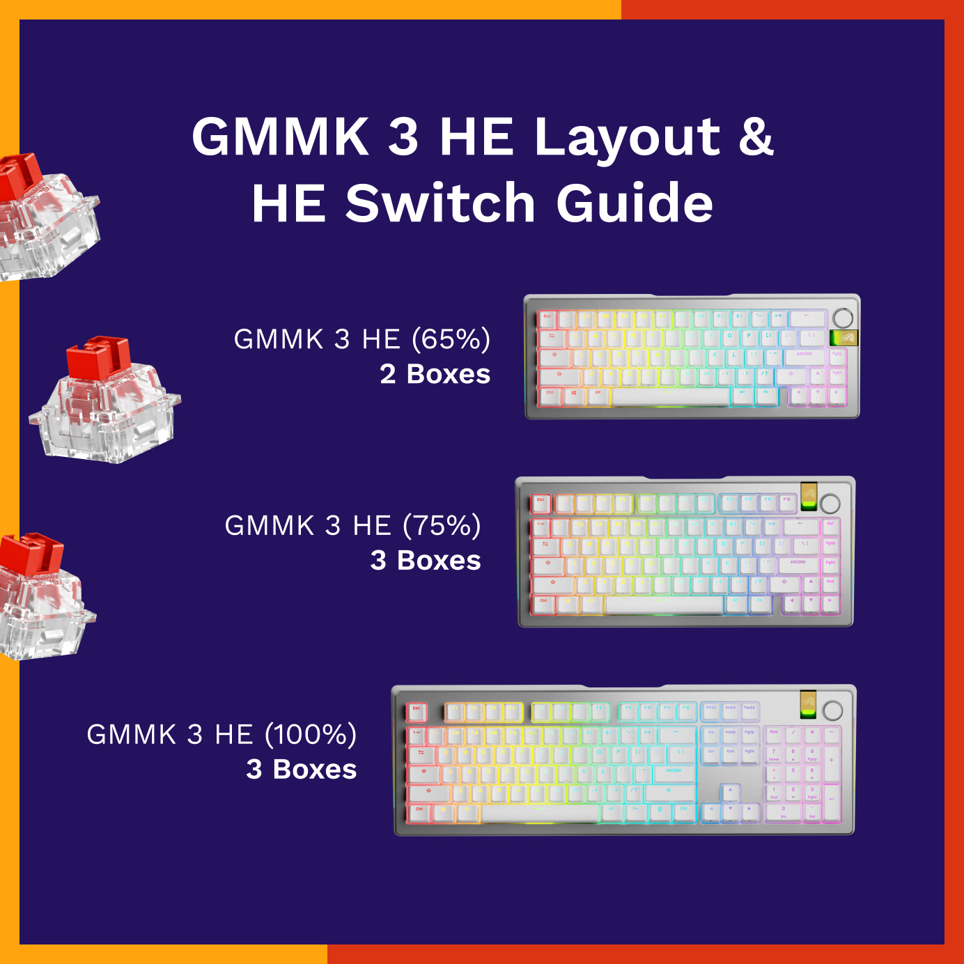 Designed for GMMK 3 HE Keyboards. Immerse yourself in the game with magnetics switches that deliver satisfyingly smooth presses, unmatched hall effect performance, and vibrant RGB goodness.