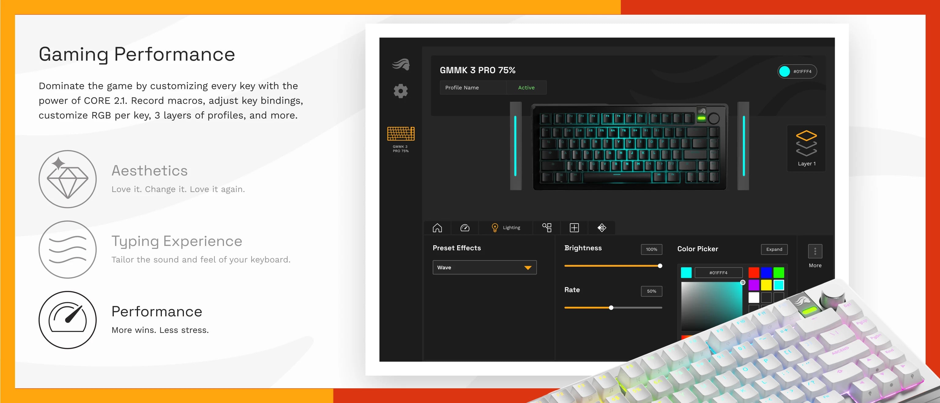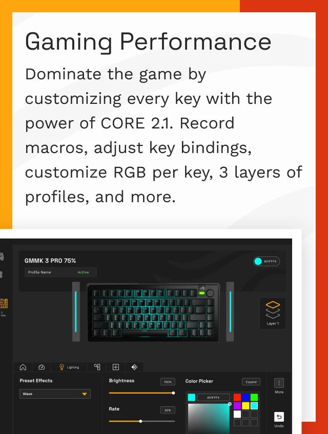 Configure any key with Glorious CORE on your Mac or PC. Program your board to your meet your needs, from hall effect performance, RGB illumination, per-key settings, and much more.