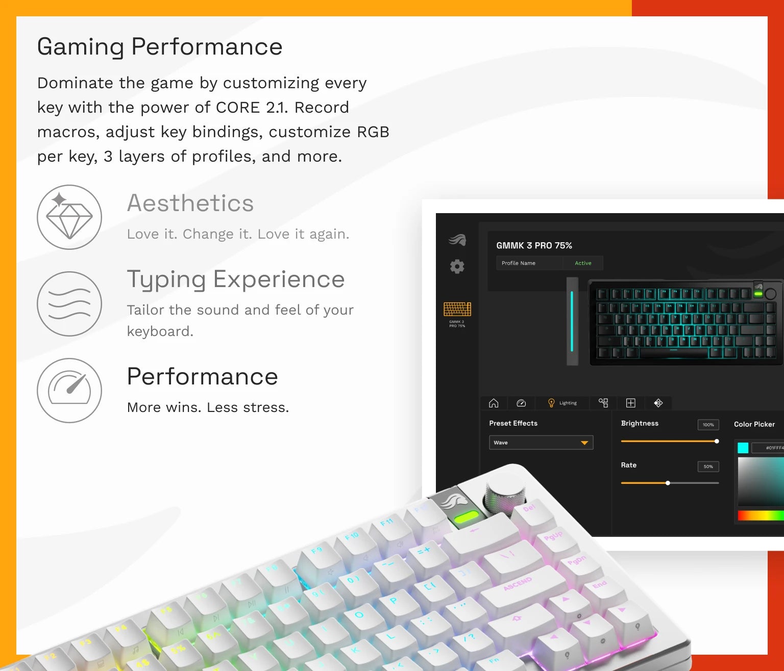 Choose your favorite color to match your GMMK 3’s look. Then, customize the knob’s function with CORE 2.1 to adjust music, media playback, and more.