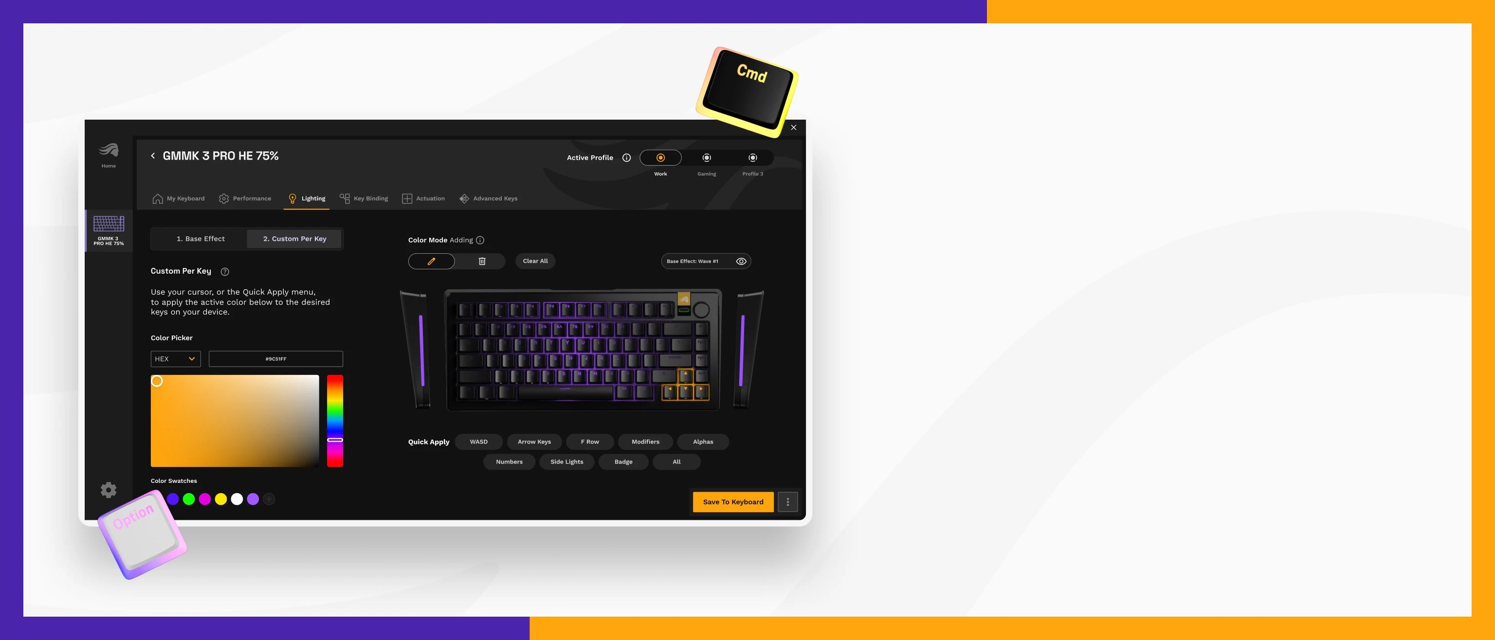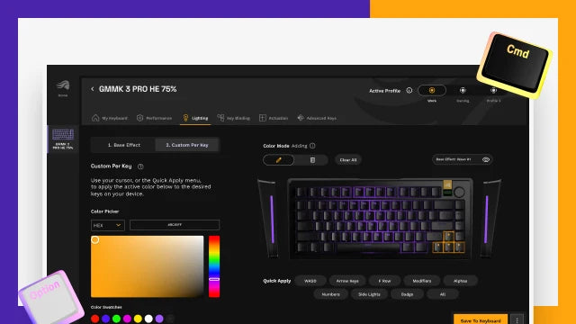 Take full advantage of your RGB keycaps by customizing your GMMK keyboard’s lighting with Glorious CORE 2.1 Software. Choose from a range of preset effects, or customize color per-key to do your own thing.